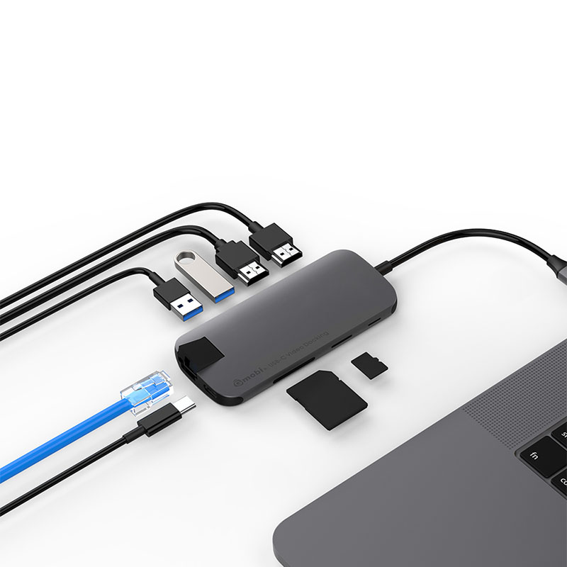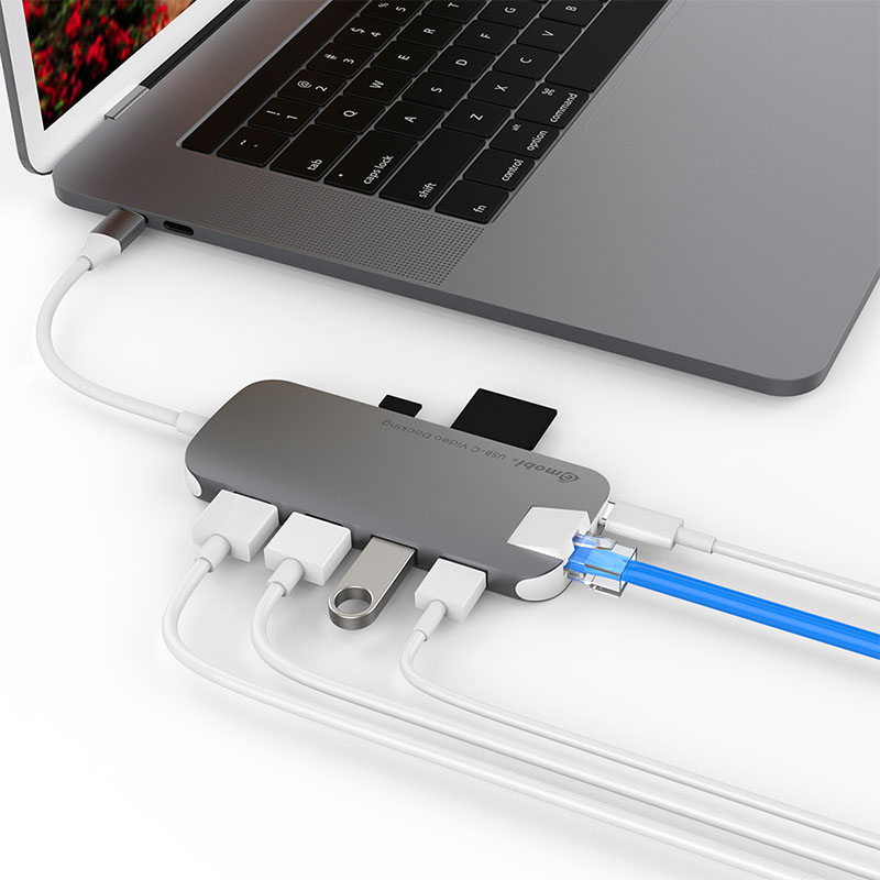 This 8 in 1 dual HDMI multi-port USB-C adapter GN31D is a multi-port Type-C adapter compatible for Macbook & Chromebook and other USB-C enabled devices, it has 2 USB3.0 extension ports, 1 standard SD, 1 micro SD, 1 HDMI, 1 Type-C female connector for USB PD charging and 1 Gigalan Ethernet.
