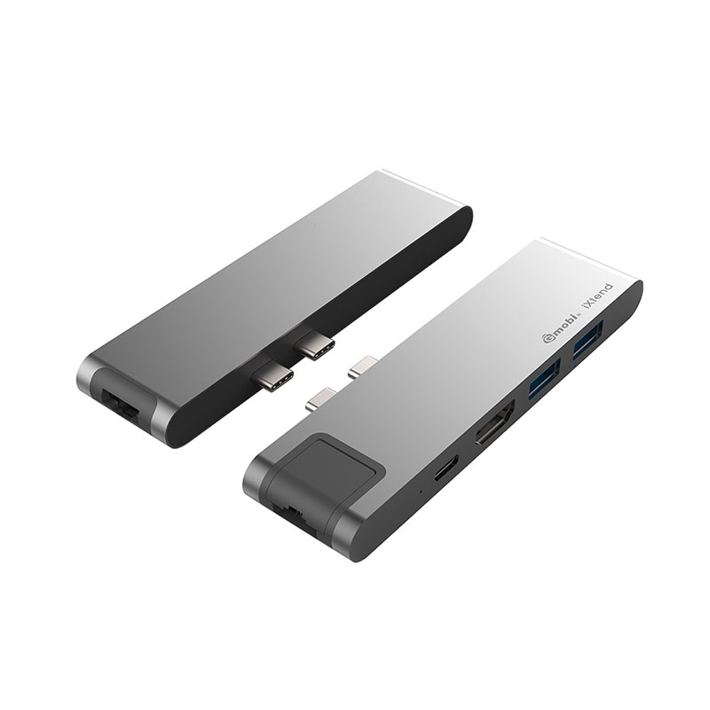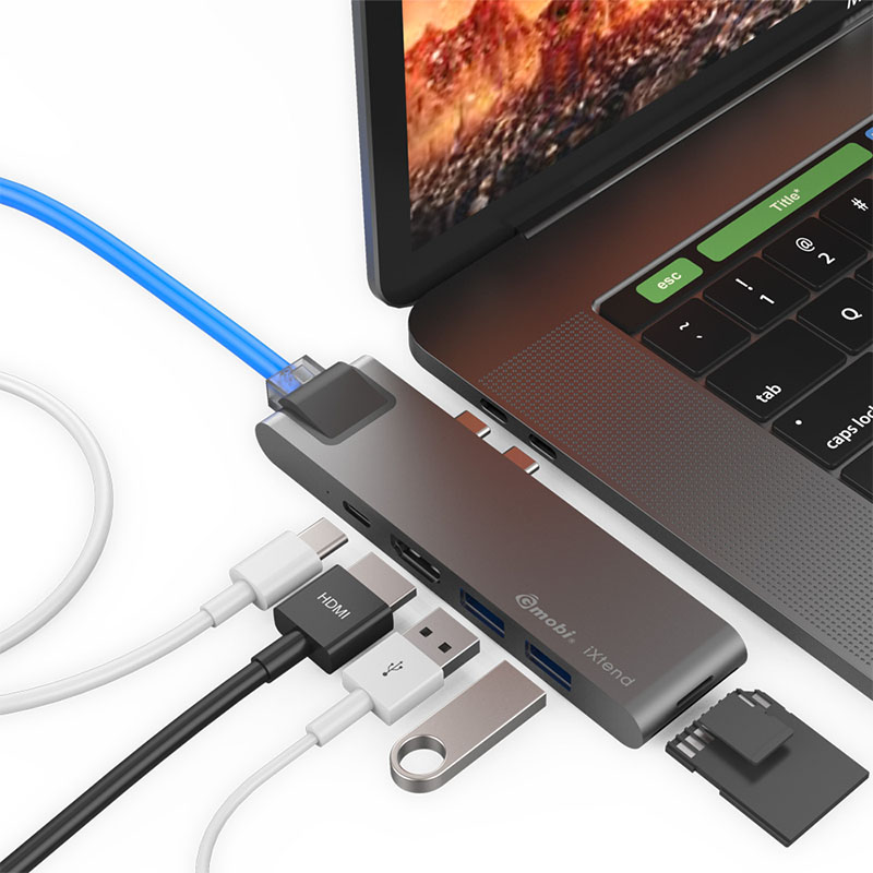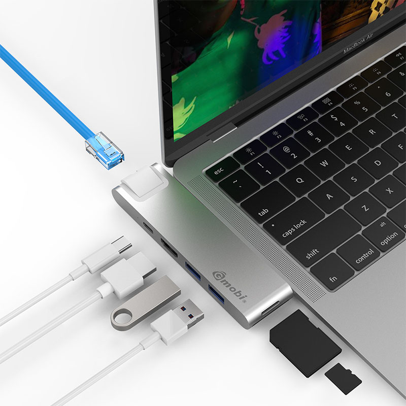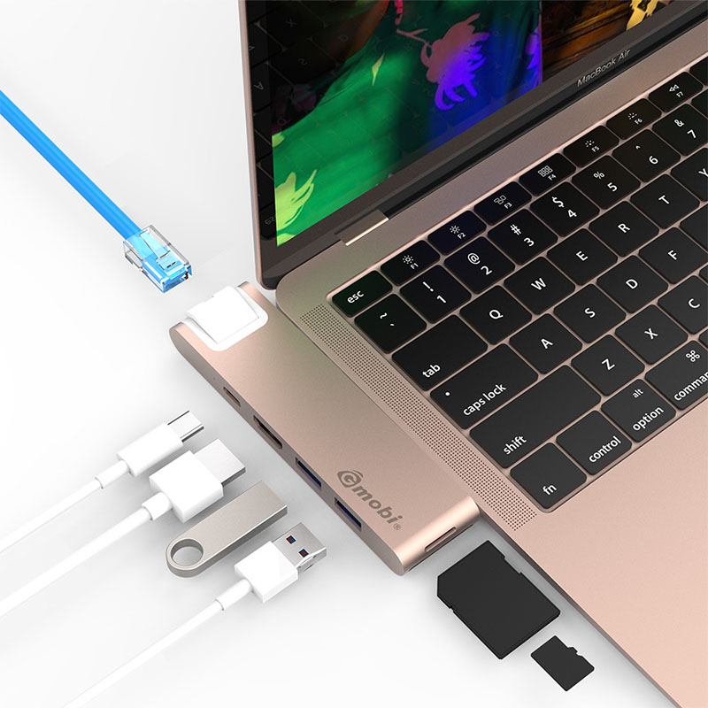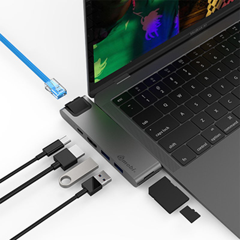 This 9 in 1 USB C Hub GN29L is a multi-port Type C adapter for MacBook Pro, it has 2 USB 3.0 extension ports, 1 standard Mircro SD, 1 standard SD, 1 HDMI, 1 Gigalan Ethernet and 1 Type C female connector for data transfer and PD charging.