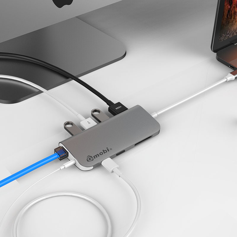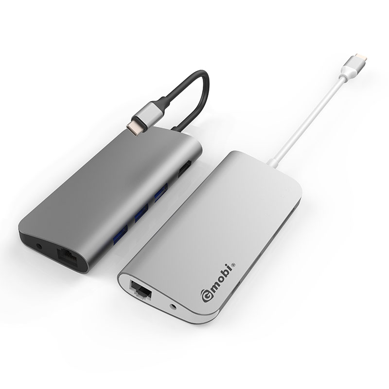 This 9 in 1 Multiport USB-C Hub GN30F is a multi-port Type-C adapter compatible for Macbook & Chromebook and other USB-C enabled devices, it has 3 USB3.0 extension ports, 1 standard SD, 1 micro SD, 1 HDMI, 1 audio connector, 1 Type-C female connector for USB PD charging and 1 Gigalan Ethernet.